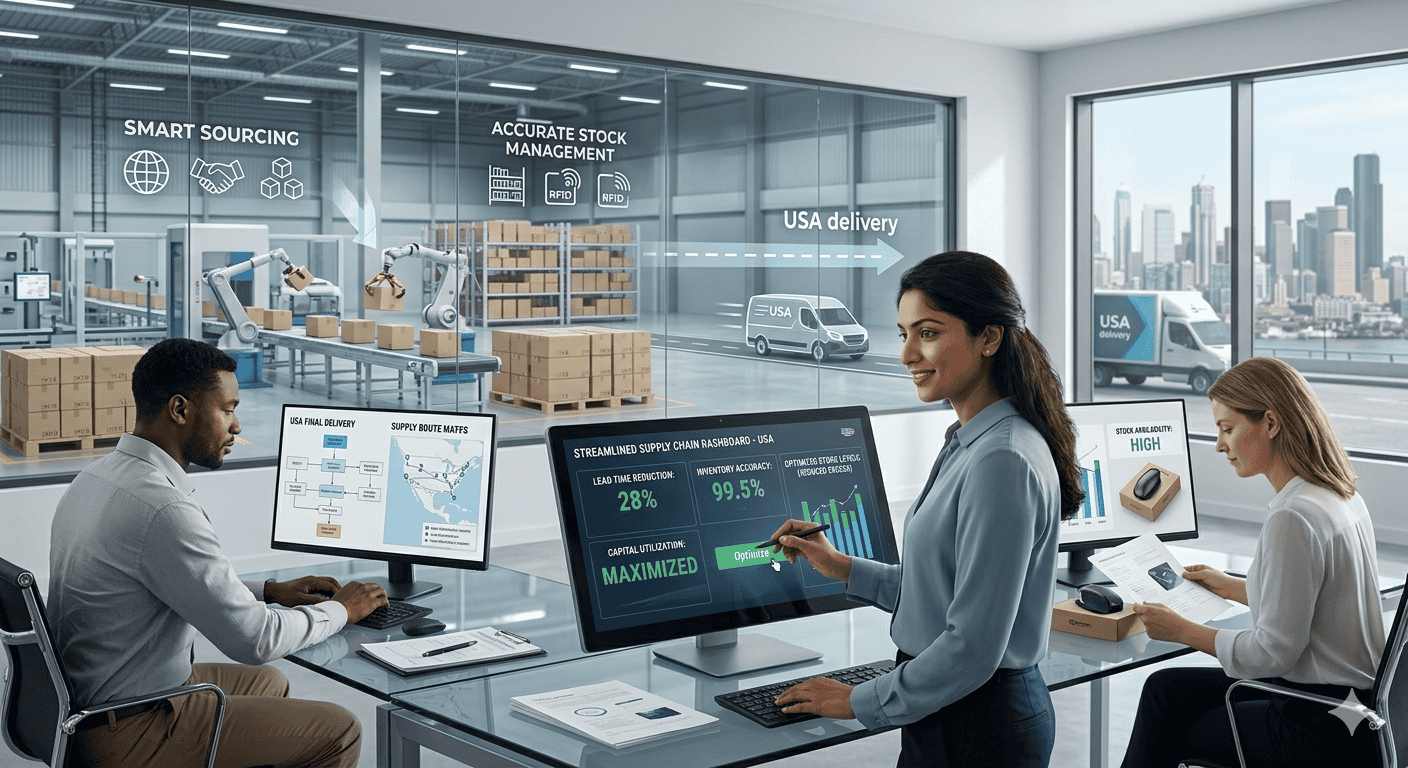 Smart Supply Chain Management We know that a brand is only as good as its fulfillment. Our team streamlines your entire supply chain from initial sourcing to final delivery in the USA. By optimizing lead times and managing stock levels accurately we make sure your products are always available for your customers without tying up too much of your capital in excess inventory.