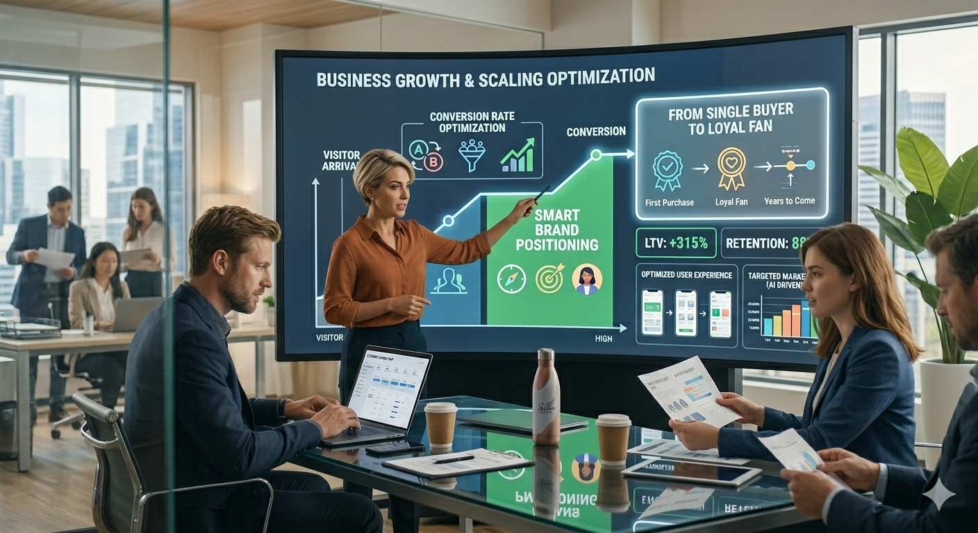Growth and Scaling Optimization Growing a business is a science that we have mastered. We focus on conversion rate optimization and smart brand positioning to make sure every visitor counts. Our goal is to turn someone who buys once into a loyal fan of your brand for years to come through better user experiences and targeted marketing.